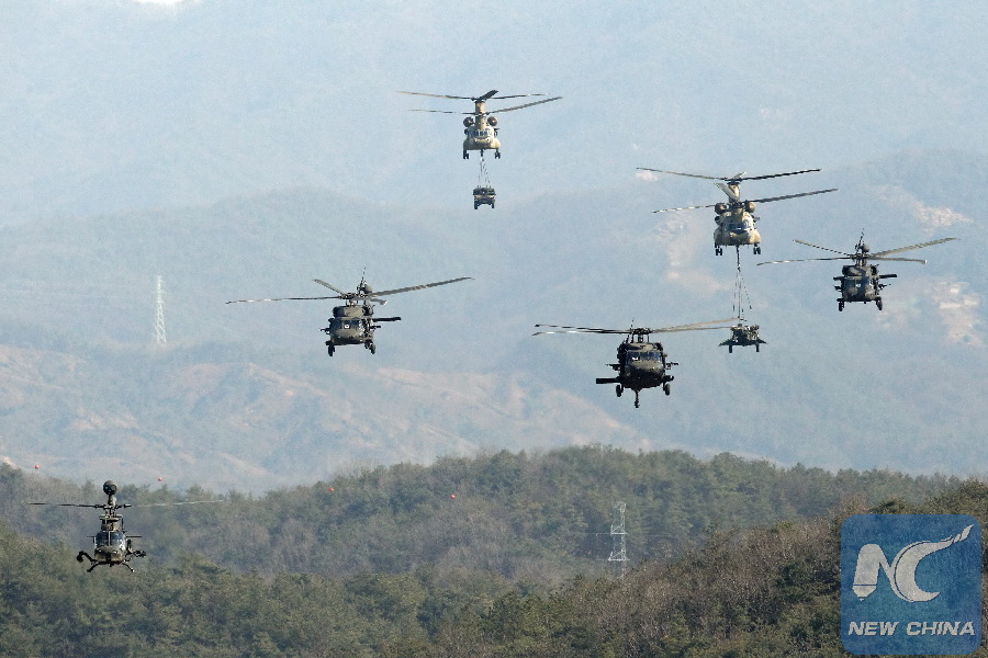 File photo: Armored helicopters convoy cargo helicopters during the annual joint military exercise Foal Eagle between South Korea and the United States in Pocheon, northeast of Seoul, March 25, 2015. (Xinhua/Seongbin Kang)