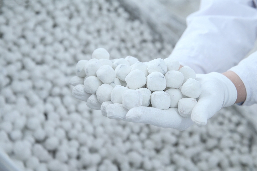 A worker checks the quality of sweet dumplings, glutinous rice-made puddings stuffed with fillings, in a food company in Beijing, capital of China, on Feb. 17, 2019. (Xinhua)