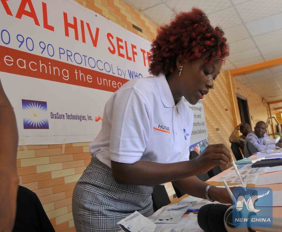 Gertrude Asiimwe, Human Diagnostics Uganda Customer Relations Officer demonstrates how an oral HIV self-testing kit is used during an exhibition in Kampala, capital of Uganda, July 17, 2017. The Ministry of Health is planning to introduce an oral HIV self-test kit as part of measures to encourage men to find out their HIV/AIDs status. (Xinhua/Joseph Kiggundu)