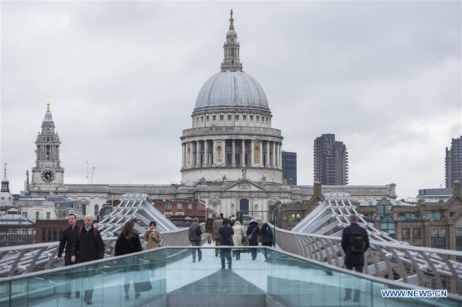 Office workers from financial institutions cross the Millennium Bridge, with St. Paul's Cathedral in the background, in London, on March 6, 2019. As Britain is set to leave the European Union (EU) on March 29, UK Finance firms have been preparing for a "no-deal" scenario that they believe would be "catastrophic" for the nation's economy. (Xinhua/Stephen Chung)