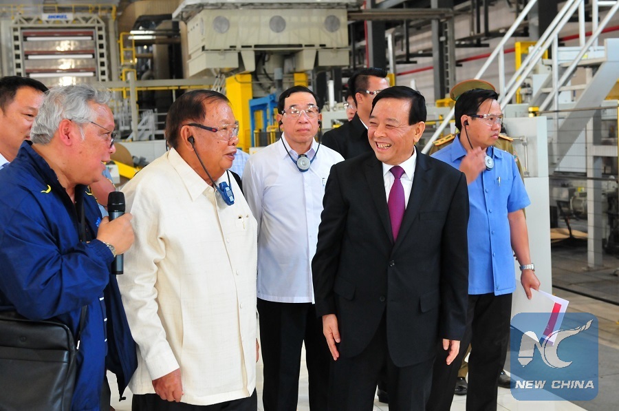 Bounnhang Vorachith (2nd L), general secretary of the Lao People's Revolutionary Party Central Committee and president of Laos, accompanied by Li Hongxin (2nd R), the president of Shandong Sun Paper Group, inspects the Sun Paper Holdings Laos Co., Ltd. (Sun Paper Laos) in Xepon, Savannakhet Province in central Laos, March 10, 2019. (Xinhua/Zhang Jianhua)