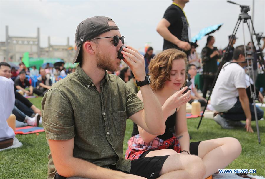Visitors enjoy tea during an outdoor tea gathering marking "Lixia", the beginning of summer in the Chinese lunisolar calendar, in Hengyang, central China's Hunan Province, May 5, 2018. China's food and beverage (F&B) industry posted a record high of 4.27 trillion yuan (636 billion U.S. dollars) in revenue in 2018, the China Cuisine Association said Sunday. The F&B industry revenue accounted for 11.2 percent of the total volume of retail sales last year, up 0.4 percentage points from 2017, said Jiang Junxian, president of the association. The F&B industry also contributed 20.9 percent to consumption growth in 2018, he said. (Xinhua/Xia Wenhui)
