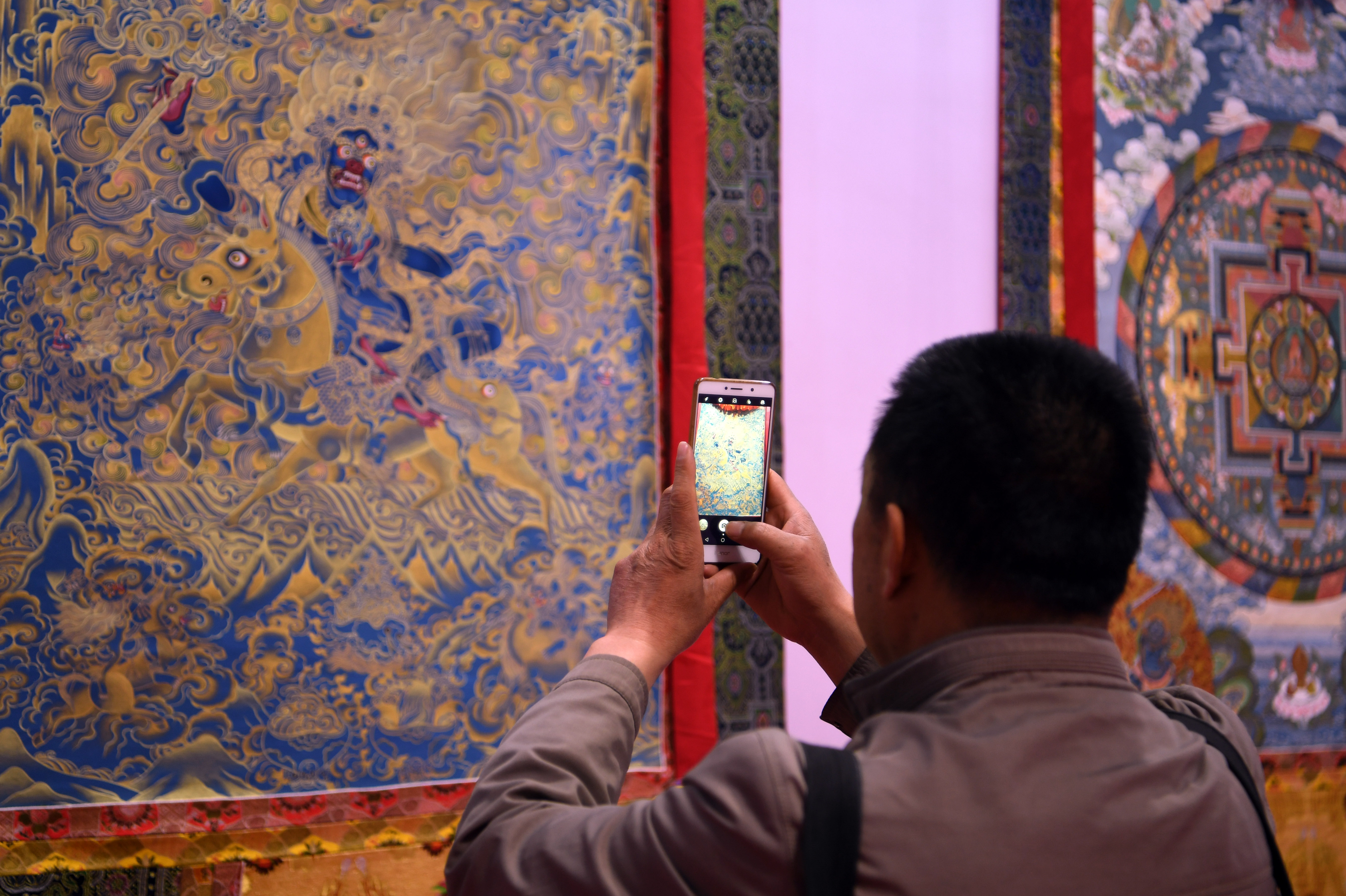 A man takes photo of a thangka painting during an art collection expo at Gansu international conference and exhibition center in Lanzhou, northwest China's Gansu Province, April 12, 2018. (Xinhua/Fan Peishen)