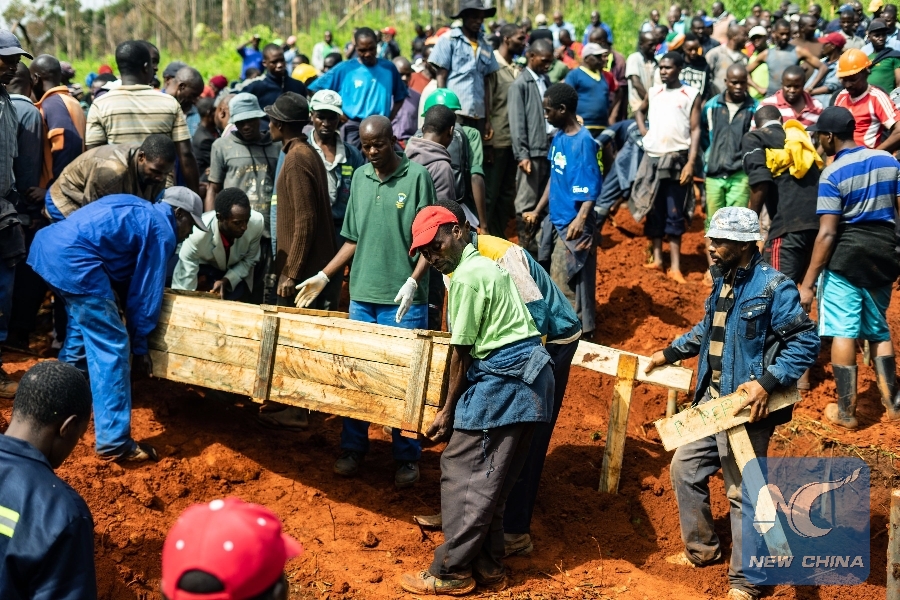 People carry coffins as mourners attend multiple burials at the Chimanimani Heroes Acre on March 18, 2019 in Chimanimani, eastern Zimbabwe, after the area was hit by Cyclone Idai. (Xinhua/AFP)