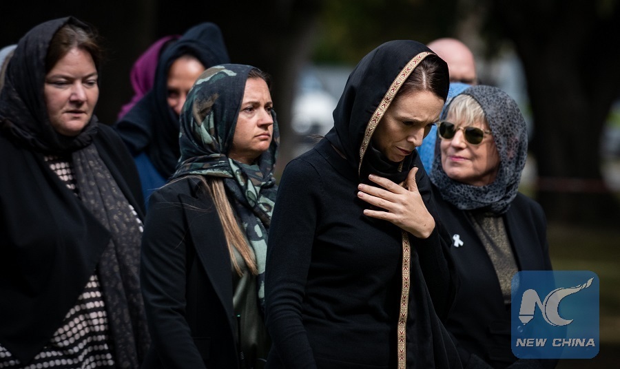 New Zealand Prime Minister Jacinda Ardern joined a national silence in mourning the Christchurch massacre victims in Christchurch, New Zealand, on March 22, 2019. (Xinhua/Zhu Qiping)