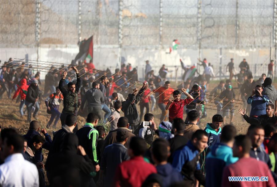 GAZA, March 22 (Xinhua) -- At least two Palestinians were shot dead and more than 62 injured by Israeli soldiers' gunfire in clashes with hundreds of demonstrators in eastern Gaza Strip on Friday afternoon, medics said.