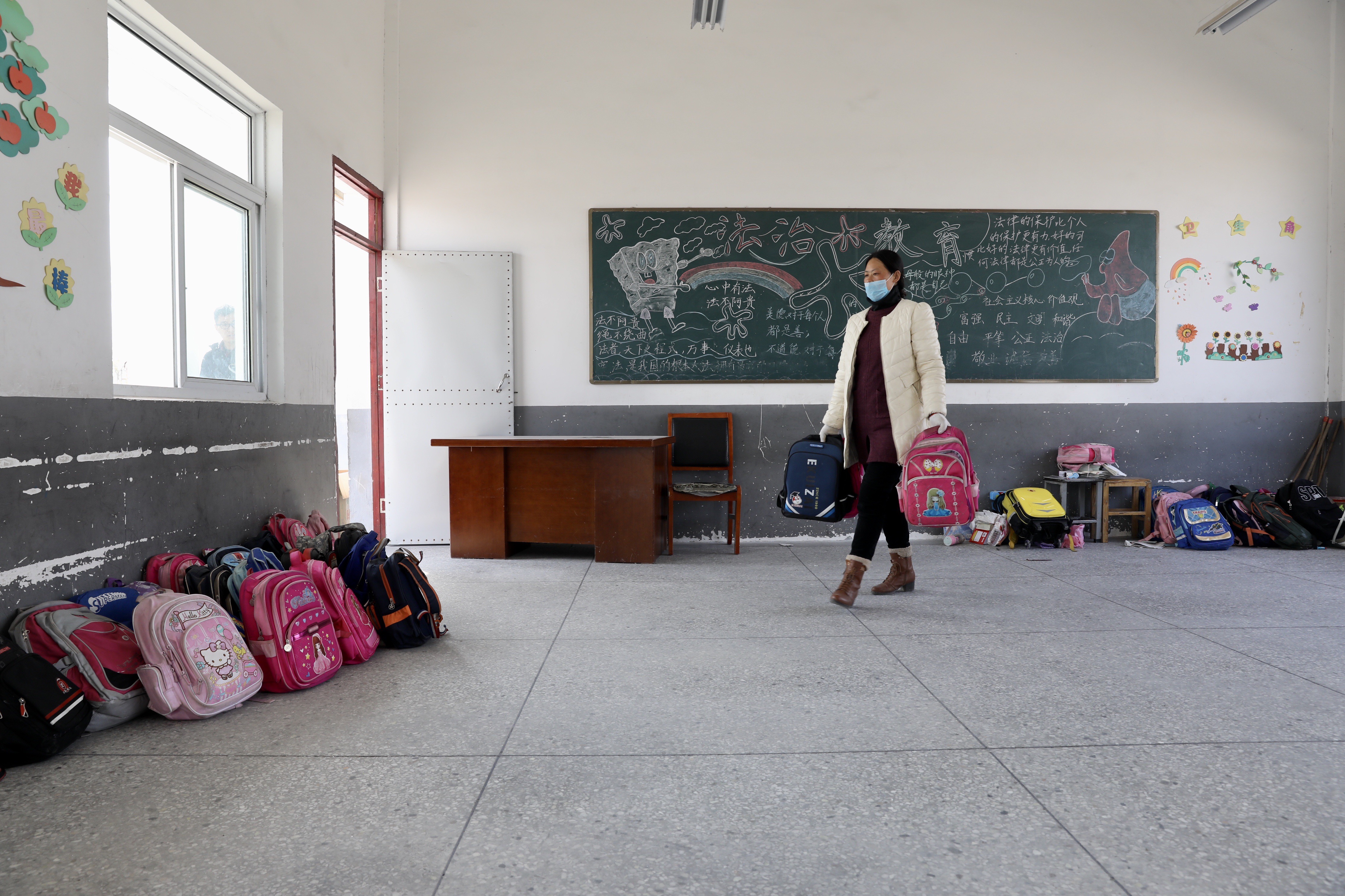 A teacher cleans a classroom at Liugang Primary School in Chenjiagang Township of Xiangshui County, Yancheng, east China's Jiangsu Province, March 23, 2019. (Xinhua/Jin Liwang)