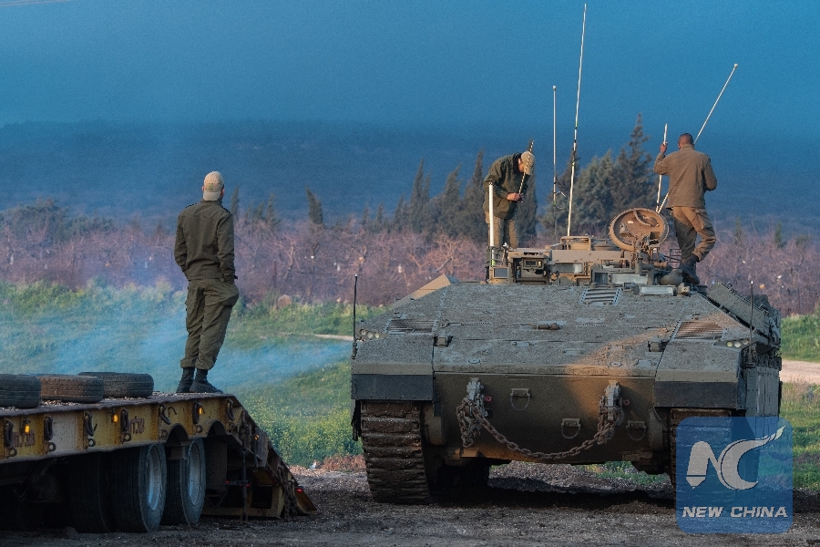 Israeli soldiers stand on an armored personnel carrier in the Israeli-occupied Golan Heights, on March 25, 2019. (Xinhua/JINI/Ayal Margolin)