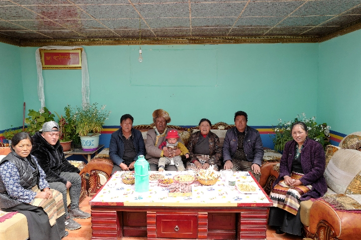 Tenzin and his family pose for a photo in their home. (Xinhua/Purbu Tashi)