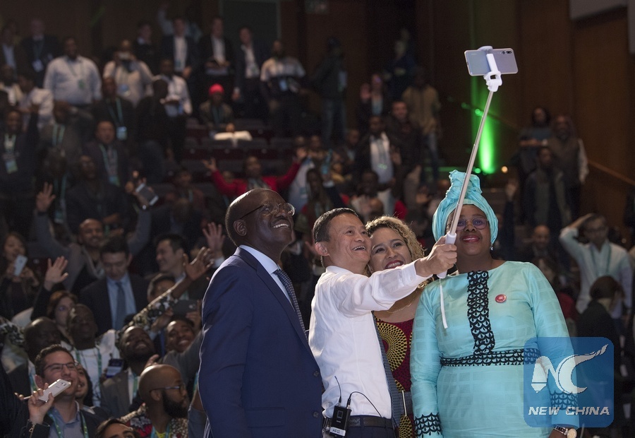 File photo shows Chinese Alibaba's Chairman Ma Yun (2nd L) takes a selfie with honor guests during the conference "The Rise of Africa's Digital Lions" in Johannesburg, South Africa, on Aug. 8, 2018. Chinese e-commerce giant Alibaba's Chairman Ma Yun launched on Wednesday here the Netpreneur Prize to support exemplary African business leaders. The prize will award 10 million U.S. dollars to 100 African entrepreneurs over the next 10 years focused on grassroots innovation, economic empowerment of women and small business. (Xinhua/Chen Cheng)