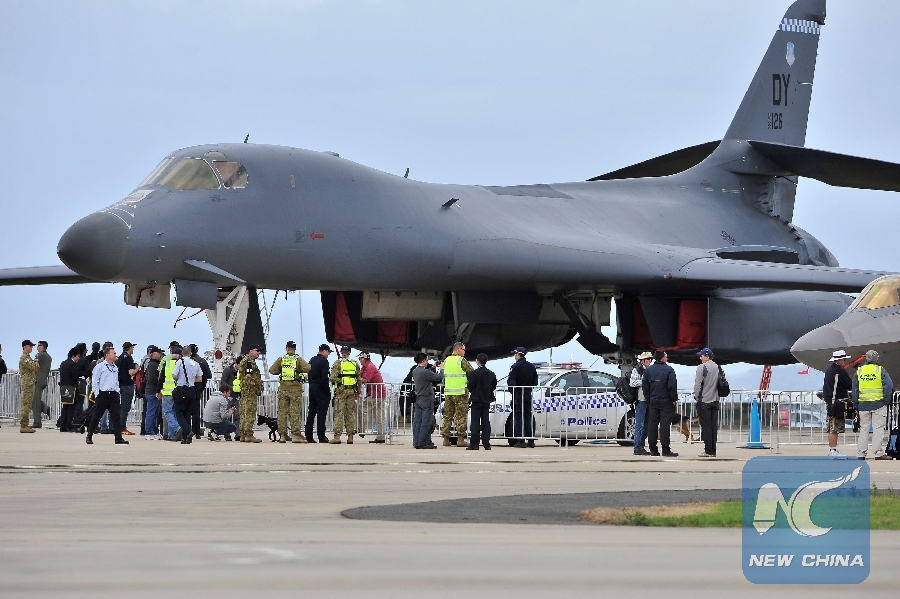 In this file photo taken on March 1, 2011, visitors view a U.S. Air Force B-1 bomber on the opening day of the Australian International Airshow and Aerospace and Defence Expo in Melbourne. (Xinhua/AFP)