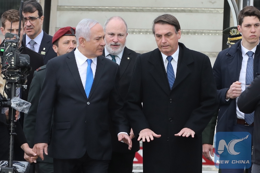 JERUSALEM, March 31 (Xinhua) -- Brazilian President Jair Bolsonaro landed in Israel on Sunday for an official visit, where he was expected to announce whether he will relocate his country's embassy from Tel Aviv to Jerusalem.