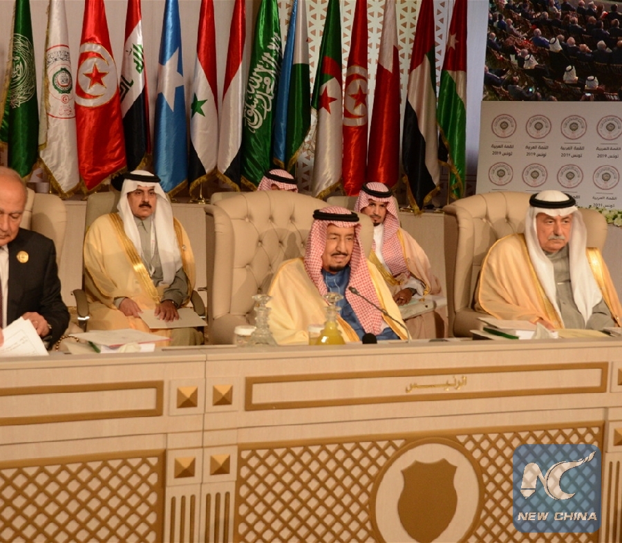 Photo of Saudi King Salman bin Abdulaziz Al (Center) at the 30th Arab Summit in Tuinis, capital of Tunisia, taken on March 31, 2019. (Xinhua photo)