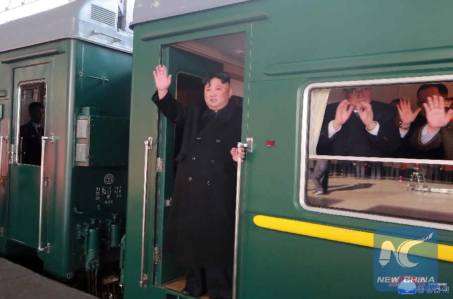 In this photo provided by the Korean Central News Agency (KCNA) on Feb. 24, 2019, Kim Jong Un, top leader of the Democratic People's Republic of Korea (DPRK), waves to senior officials who have come to see him off at Pyongyang Railway Station in Pyongyang, DPRK. Kim Jong Un left by train for Vietnamese capital Hanoi for the second DPRK-U.S. summit, the official Korean Central News Agency (KCNA) reported. (Xinhua/KCNA)
