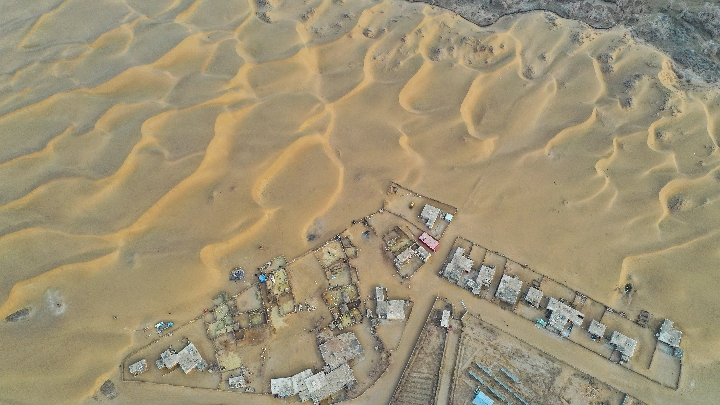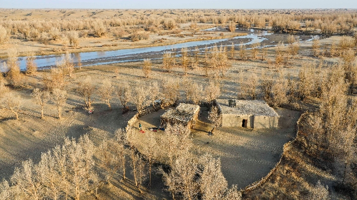 Aerial photo taken on March 17, 2019 shows Imin's home along the Keriya River at the Taklimakan Desert in Darya Boyi Town of Yutian County, northwest China's Xinjiang Uygur Autonomous Region. (Xinhua/Hu Huhu)