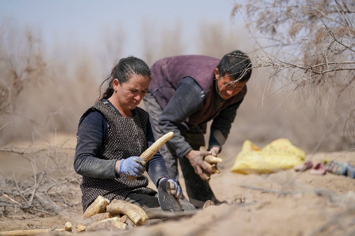 Imin (R) and his wife sort out cistanche in Darya Boyi Town of Yutian County, northwest China's Xinjiang Uygur Autonomous Region, March 17, 2019. (Xinhua/Hu Huhu)