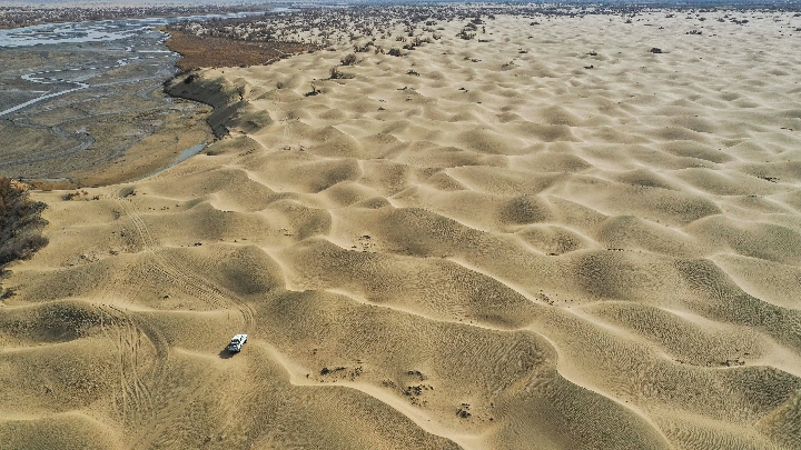 Aerial photo shows a car running in the Taklimakan Desert in Darya Boyi Town of Yutian County, northwest China's Xinjiang Uygur Autonomous Region, March 19, 2019. (Xinhua/Hu Huhu)