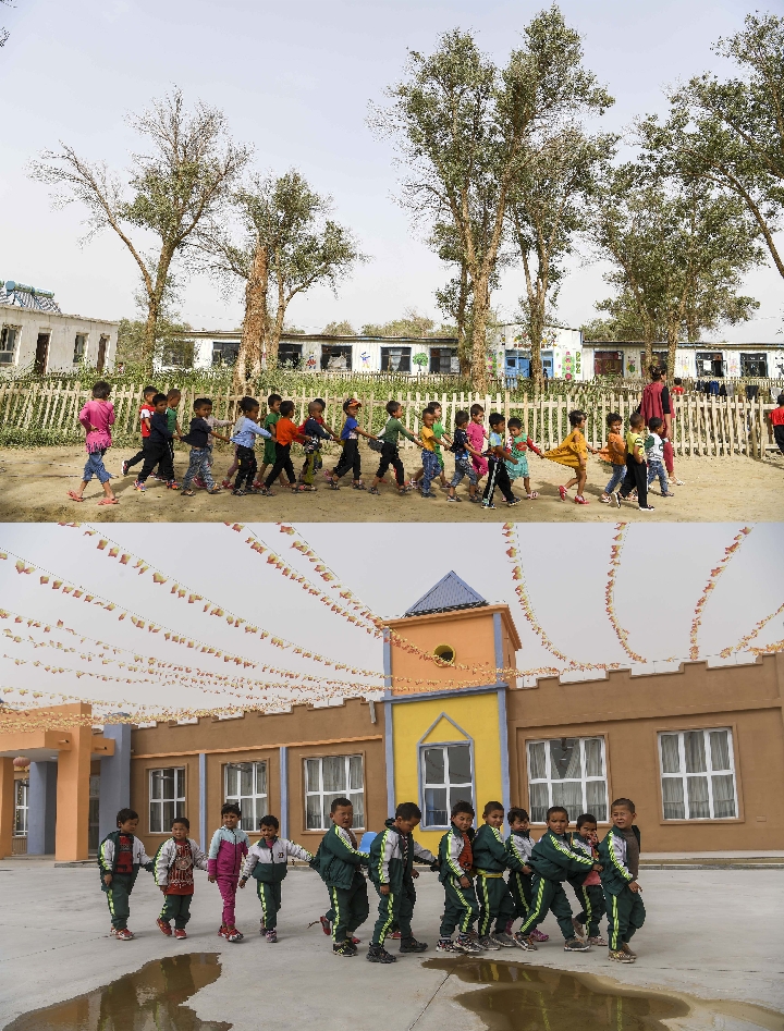 Combo photo shows students playing at a primary school in Darya Boyi Town of Yutian County, northwest China's Xinjiang Uygur Autonomous Region, Sept. 5, 2018 (upper), and students having fun at a new primary school at the new settlement for poverty relief relocation, about 110 km from the old town, in Yutian County, northwest China's Xinjiang Uygur Autonomous Region, March 20, 2019. (Xinhua/Hu Huhu)