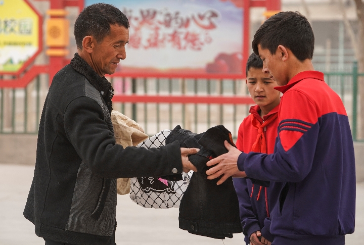 Imin (L) presents new clothes to his sons at Yutian No.1 Middle School in Yutian County, northwest China's Xinjiang Uygur Autonomous Region, March 20, 2019. (Xinhua/Hu Huhu)