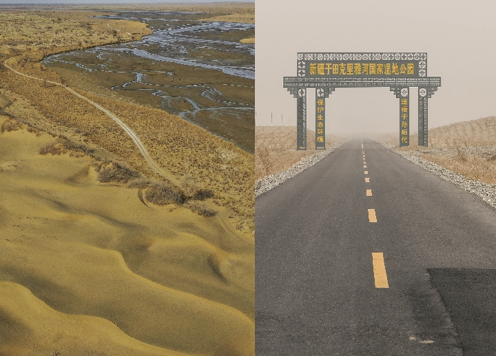Combo photo shows a road leading to Darya Boyi Town of Yutian County, northwest China's Xinjiang Uygur Autonomous Region, March 19, 2019 (L), and an asphalt road leading to the new settlement for poverty relief relocation, about 110 km from the old town, in Yutian County, northwest China's Xinjiang Uygur Autonomous Region, March 20, 2019. (Xinhua/Hu Huhu)