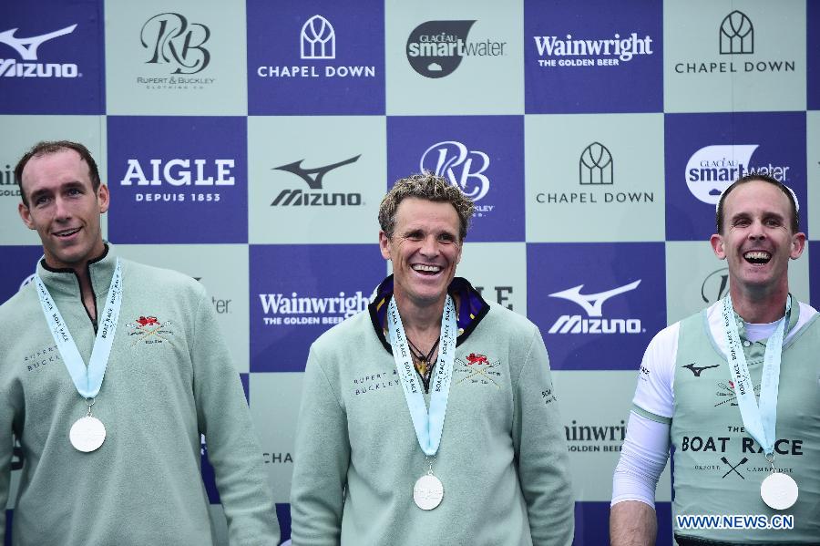 Cambridge University men's crew, double Olympic champion James Cracknell (C) celebrates winning the men's boat race between Oxford University and Cambridge University on the River Thames in London on April 7, 2019. (Xinhua/Stephen Chung)