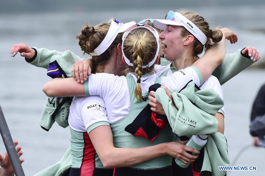 Cambridge University women's crew celebrate winning the women's boat race between Oxford University and Cambridge University on the River Thames in London on April 7, 2019. (Xinhua/Stephen Chung)