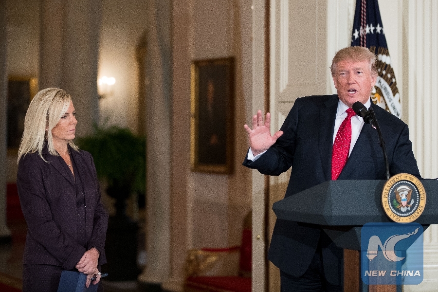 File Photo: U.S. President Donald Trump (R) speaks during the introduction of Kirstjen Nielsen as Secretary of Homeland Security nominee at the White House in Washington D.C., the United States, on Oct. 12, 2017. (Xinhua/Ting Shen)