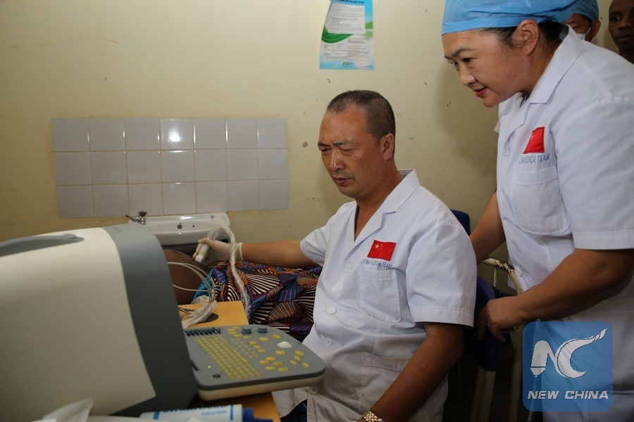 Chinese doctors examine a Rwandan patient in Kigali, capital of Rwanda, on April 4, 2019.(Xinhua/Lv Tianran)