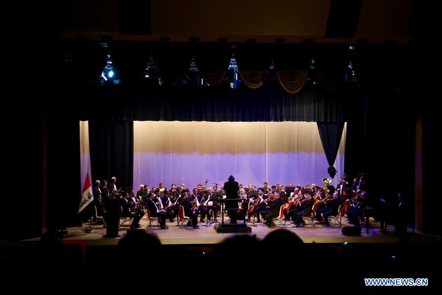 Iraqi Symphony Orchestra performs at the reopening ceremony of al-Mansour Theater in Baghdad, Iraq, on April 8, 2019. Iraqi Minister of Culture, Tourism and Antiquities Abdul Amir al-Hamdani reopened on Monday al-Mansour Theater in the heavily fortified Green Zone in downtown Baghdad after more than 15 years of closure. (Xinhua/Khalil Dawood)