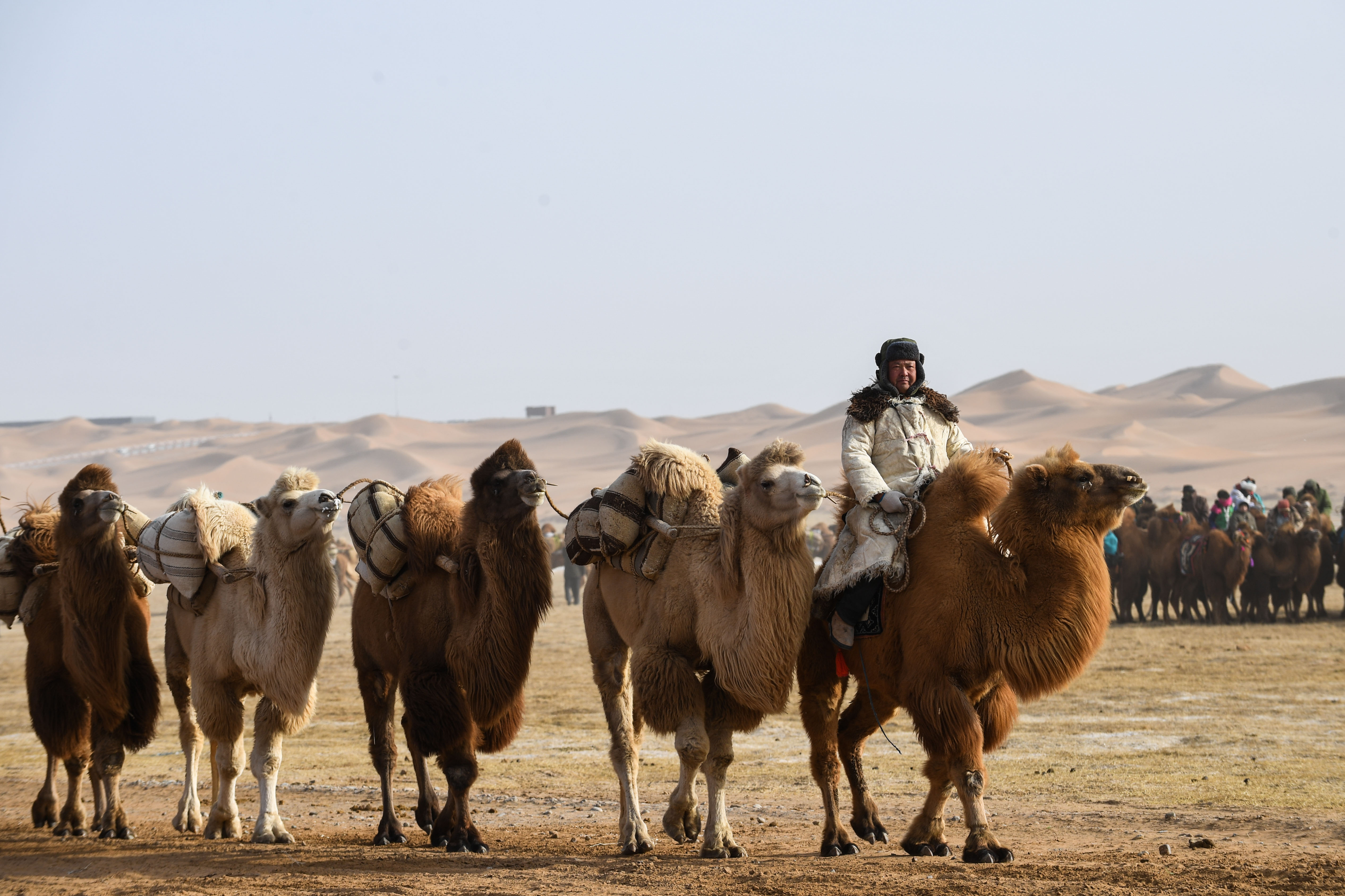 A herdsman leads a team of camels during the 2nd camel Nadam fair in Alxa, north China's Inner Mongolia Autonomous Region, on Dec. 27, 2018. (Xinhua/Liu Lei)