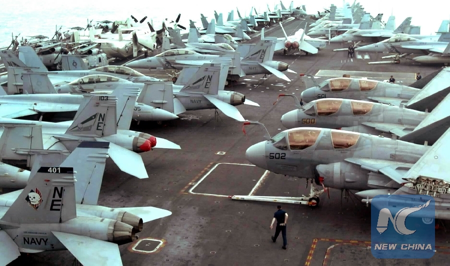 File Photo: A U.S. soldier walks to the board berthed with planes on the nuclear-powered U.S. aircraft carrier USS Abraham Lincoln in Hong Kong, south China, April 6, 2006. (Xinhua/Tao Ming)