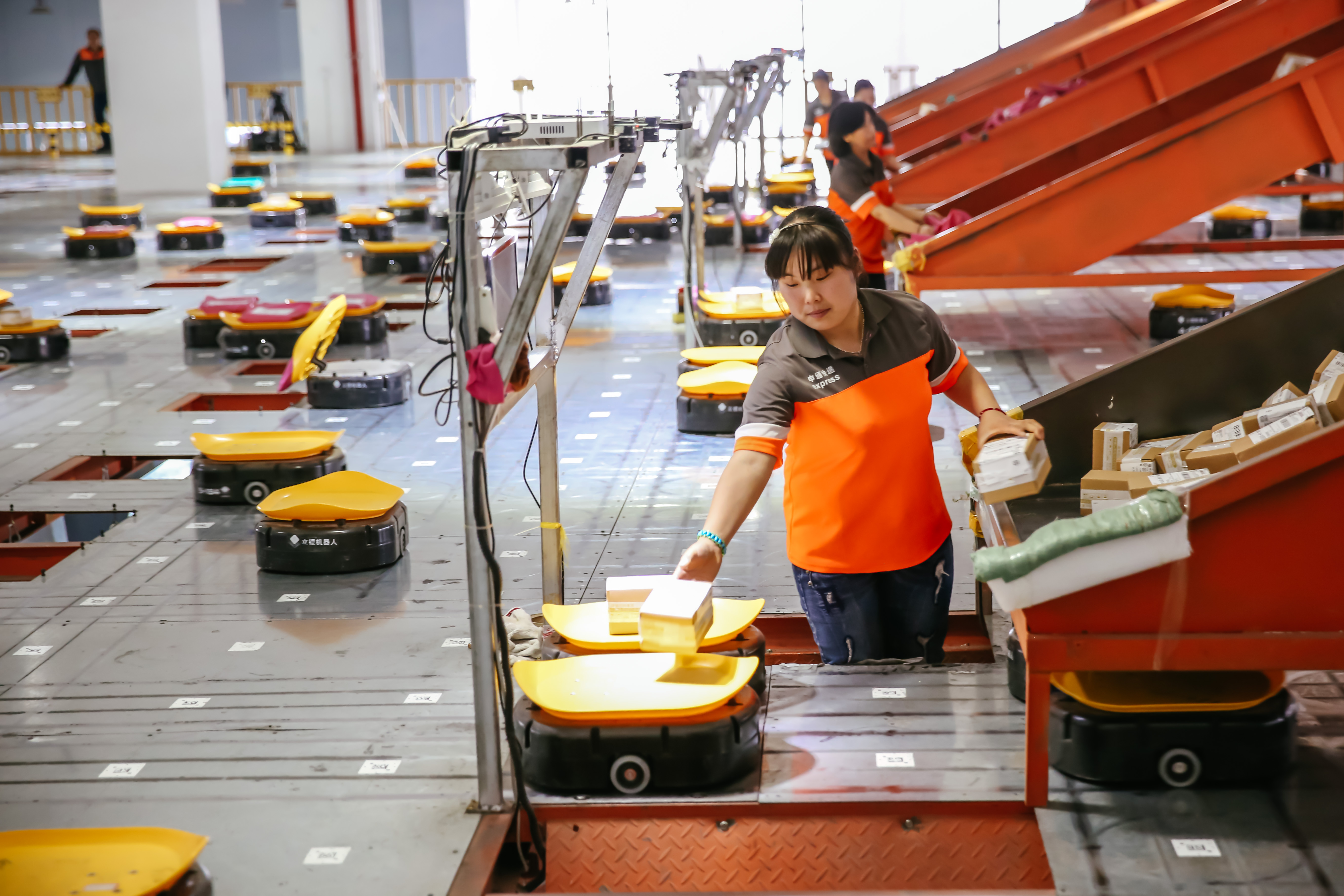 Workers putting parcels on automated robots at a STO Express warehouse in Yiwu, east China's Zhejiang Province, May 3, 2017. The robots then sort the parcels automatically according to their weight and the information on the waybills. (Xinhua/Zhang Cheng)