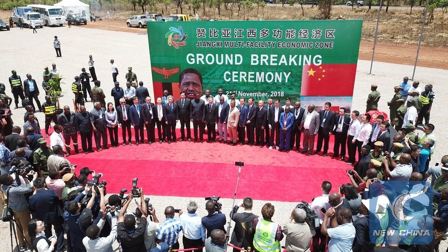 File photo shows people attend the ground breaking ceremony of Jiangxi Multi-Facility Economic Zone in Chibombo district, central province of Zambia, Nov. 22, 2018.(Xinhua/Wang Chao)