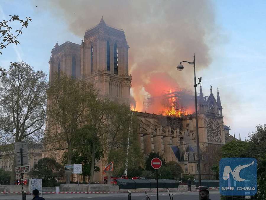 PARIS, April 15 (Xinhua) -- Spire of Notre Dame Cathedral in central Paris collapsed in a huge fire on Monday afternoon.