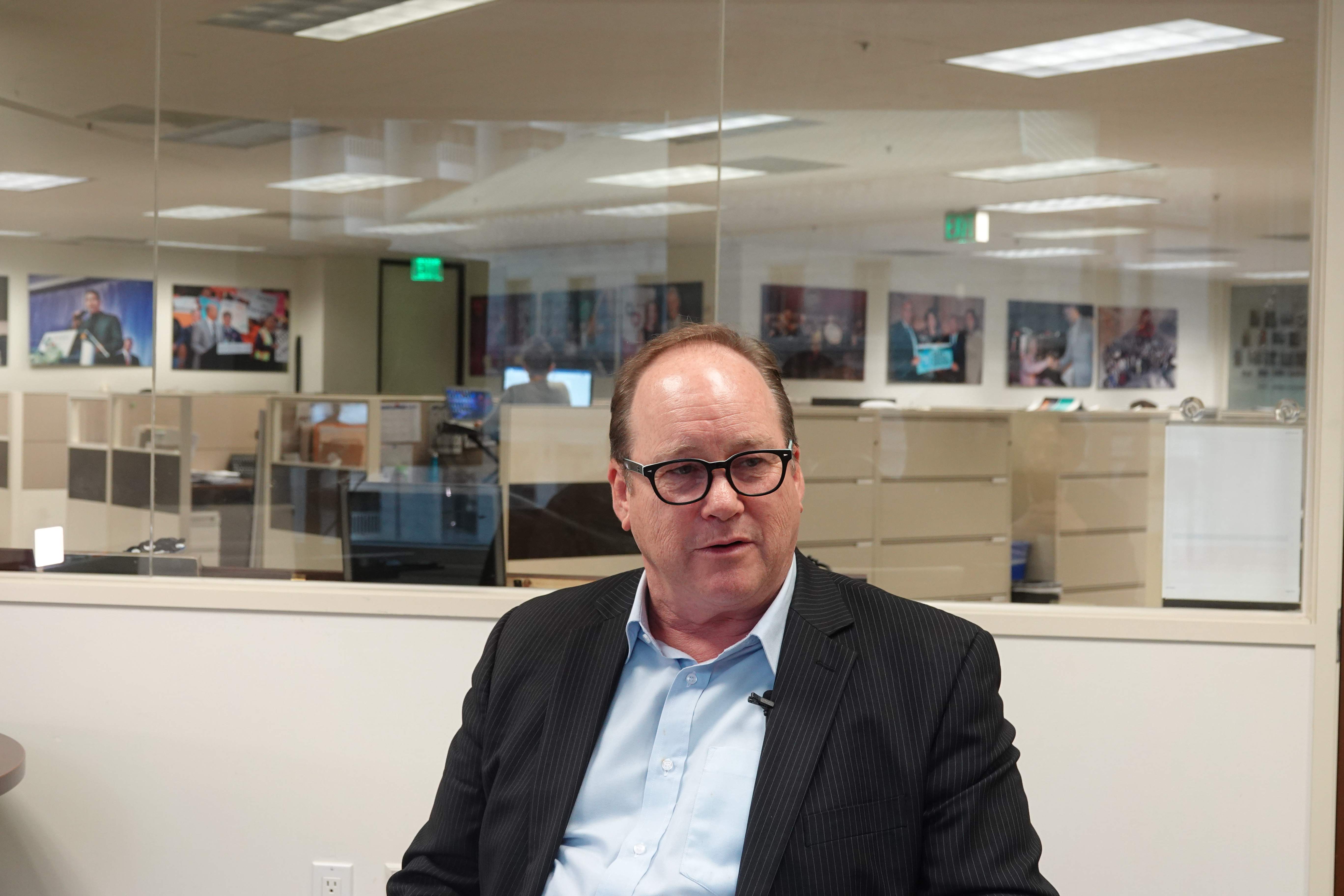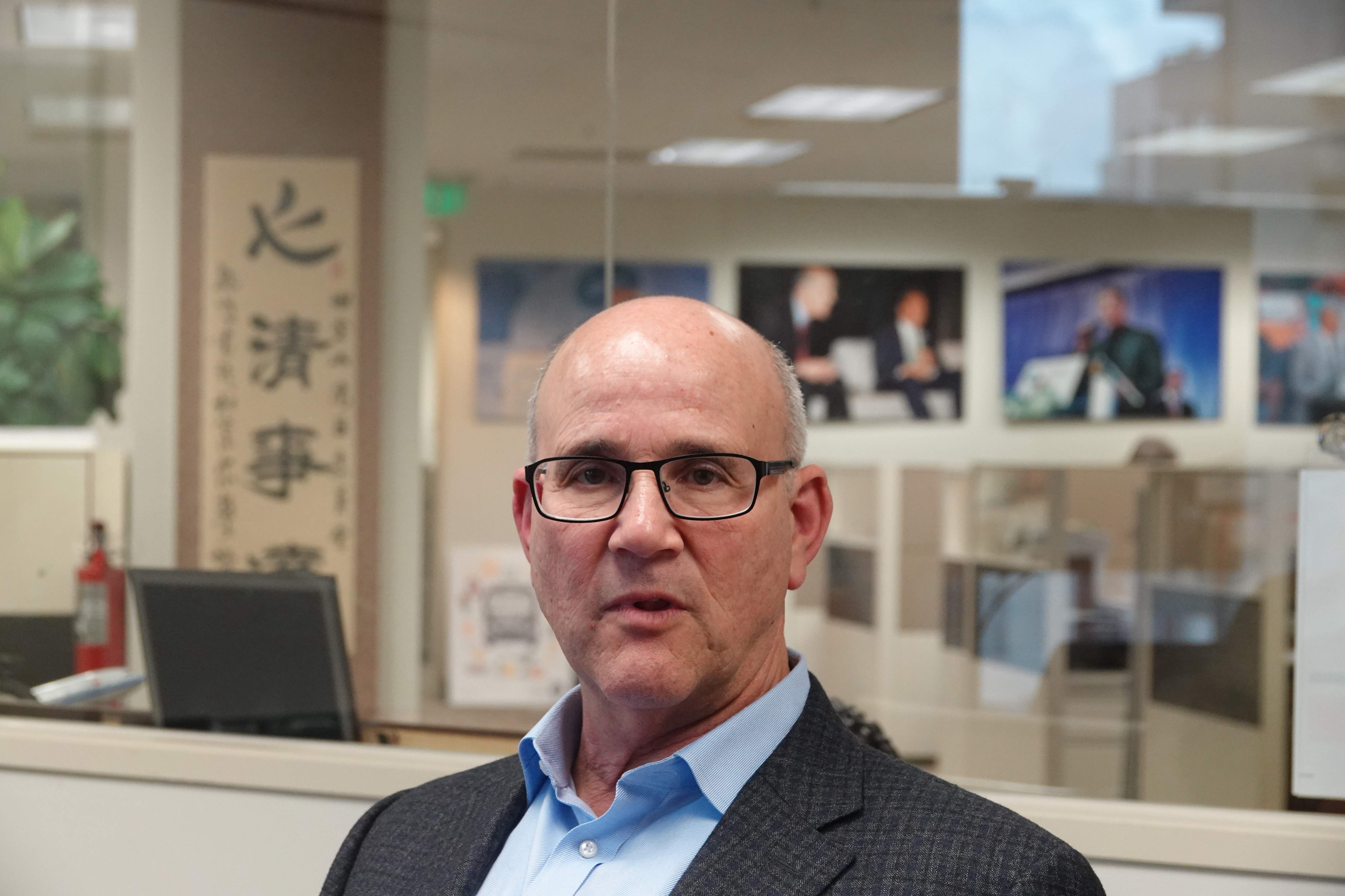 Del Christensen, chief of global business development for the Bay Area Council (BAC), receives an interview with Xinhua in San Francisco, the United States, on March 27, 2019. (Xinhua/Wu Xiaoling)