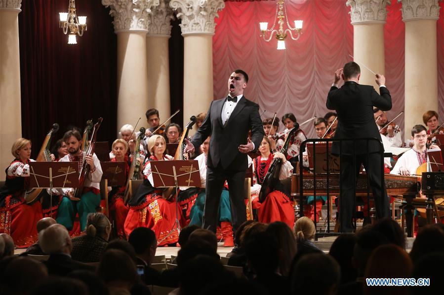 A Ukrainian singer performs in a concert marking the 70th anniversary of the founding of the People's Republic of China (PRC) in Kiev, Ukraine, April 16, 2019. Staged at the National Philharmonic of Ukraine, the concert was performed by the National Academic Orchestra of Folk Instruments of Ukraine (NAONI), the chorus of students of the National Music Academy of Ukraine (NMAU) named after P.I. Tchaikovsky and solo artists from China and Ukraine. (Xinhua/Sergey)
