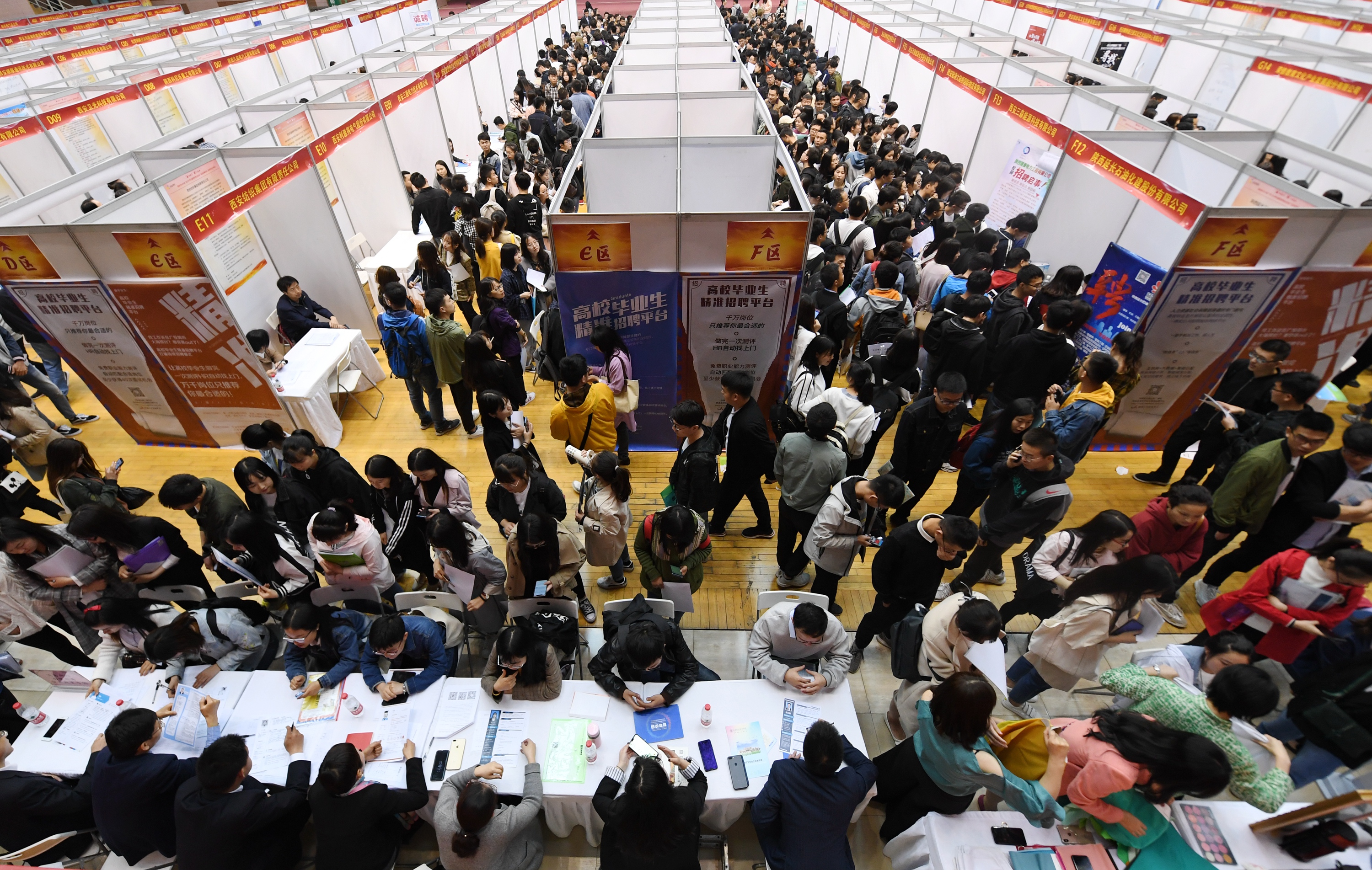 Job seekers are seen at a recruitment fair at Shaanxi University of Science and Technology in Xi'an, northwest China's Shaanxi Province, April 12, 2019. (Xinhua/Zhang Bowen)