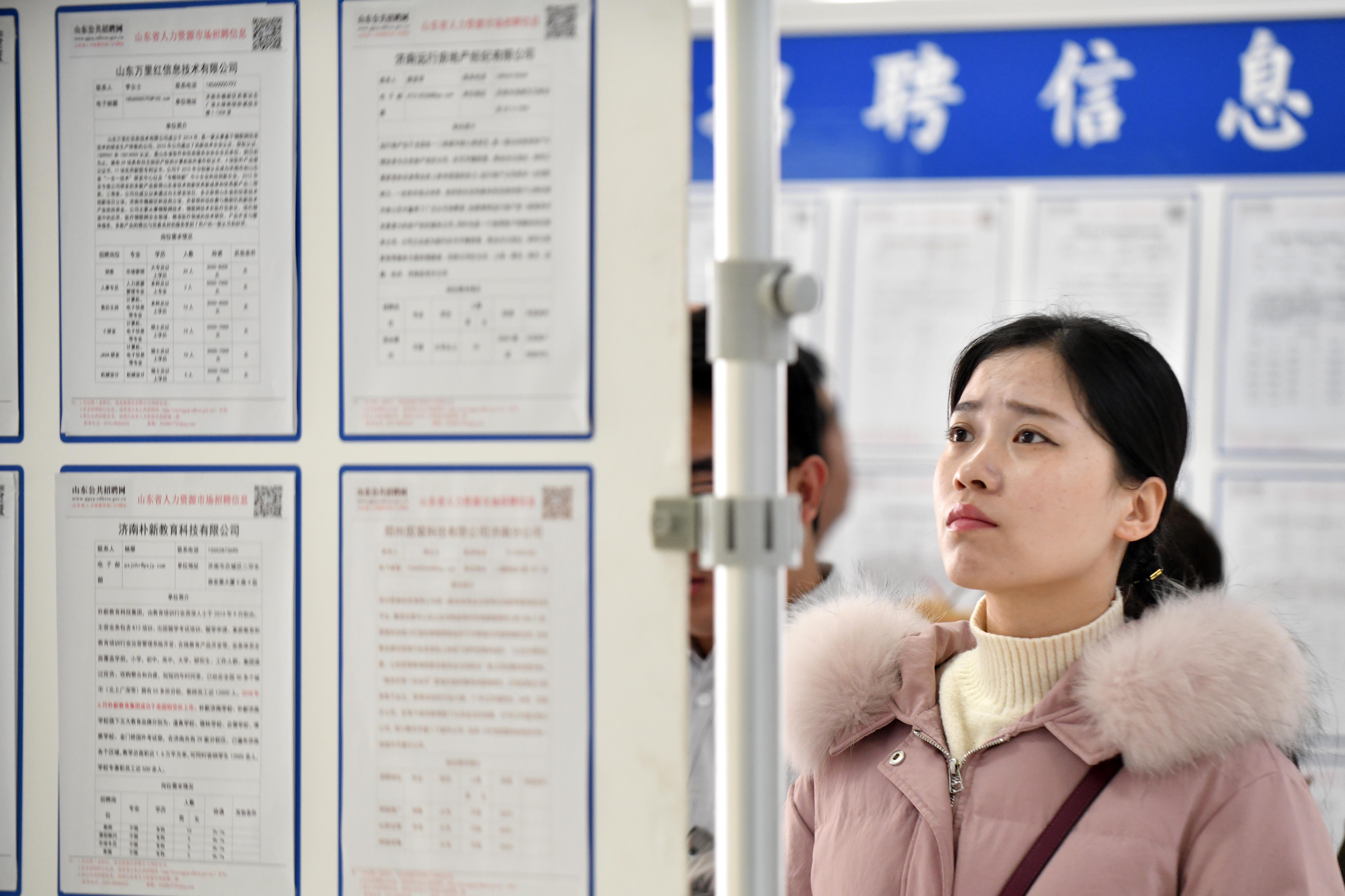 A job seeker reads recruitment information at a job fair in Jinan, east China's Shandong Province, Feb. 22, 2019. (Xinhua/Guo Xulei)