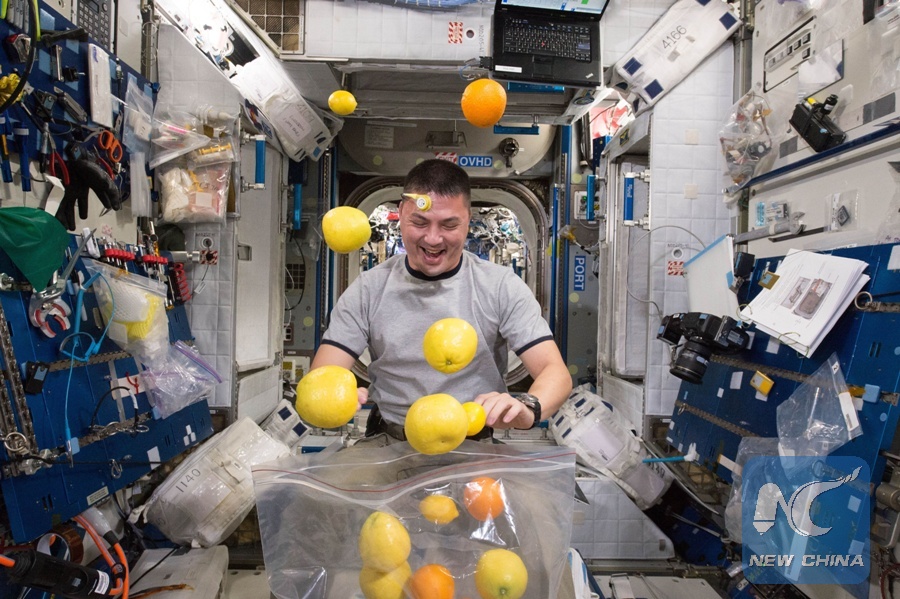 This NASA photo obtained August 27, 2015 shows NASA astronaut Kjell Lindgren corrals the supply of fresh fruit that arrived August 25, 2015 on the Kounotori 5 H-II Transfer Vehicle. Visiting cargo ships often carry a small cache of fresh food for crew members aboard the International Space Station. (NASA/AFP PHOTO)