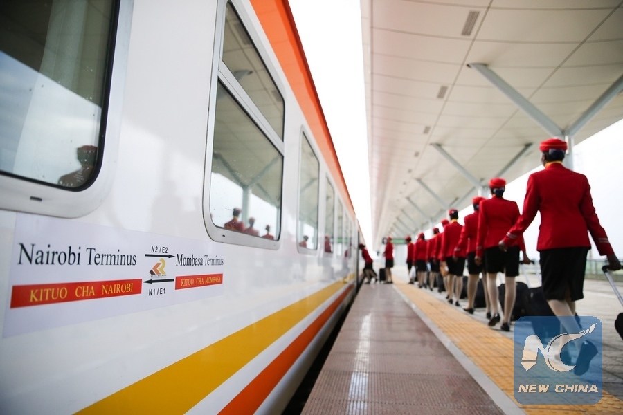 Crew go aboard a train at Mombasa Terminus of the Mombasa-Nairobi Standard Gauge Railway in Kenya on June 1, 2017. (Xinhua/Pan Siwei)