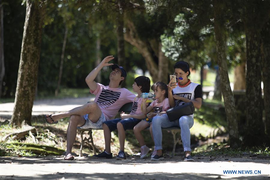 Photo taken on March 27, 2019 shows visitors resting at the Rio de Janeiro Botanical Garden in Rio de Janeiro, Brazil. The Rio de Janeiro Botanical Garden, built in 1808, is located at the foot of Corcovado mountain and covers an area of 140 hectares. (Xinhua/Li Ming)
