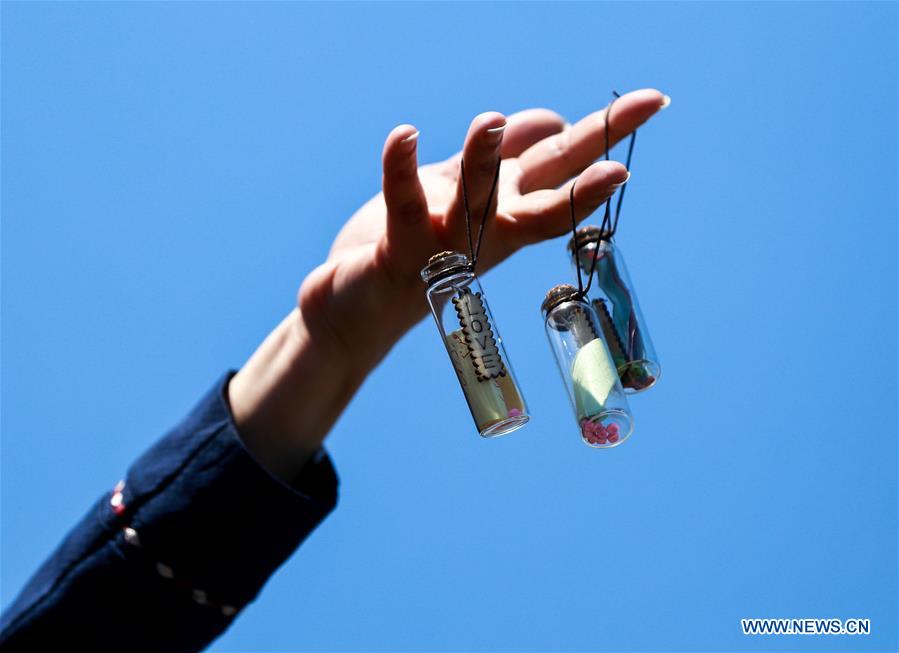 A Palestinian holds sealed bottles with letters before tossing them into the sea, at Gaza's fishing harbor in Gaza City, April 22, 2019. Dozens of Palestinian youths in Gaza City have sent letters to countries around the world, demanding solution to their problems and the lift of Israel's blockade on the Gaza Strip. These letters were written on Monday during an event held at Gaza's fishing harbor, before being sealed in small bottles and tossed into the sea. (Xinhua/Yasser Qudih)