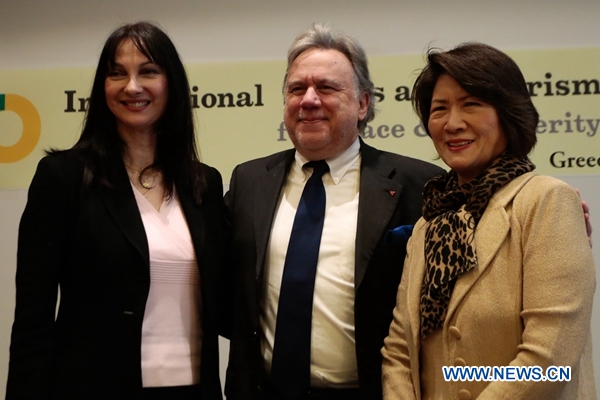 Greek Foreign Minister George Katrougalos (L), Greek Tourism Minister Elena Kountoura (C), and Dho Young-shim (R), chairperson of the UN World Tourism Organization's Sustainable Tourism for Eliminating Poverty (ST-EP) Foundation and also head of a preparatory provision committee for the International Sports and Tourism Organization for Peace and Prosperity (ISO for P&P) , pose for photos at a press conference for the presentation of the ISO for P&P in Athens, Greece, on April 22, 2019. Greece presented on Monday the ISO for P&P, a new international organization which aims to promote peace and prosperity worldwide through tourism and sports. (Xinhua/Marios Lolos)