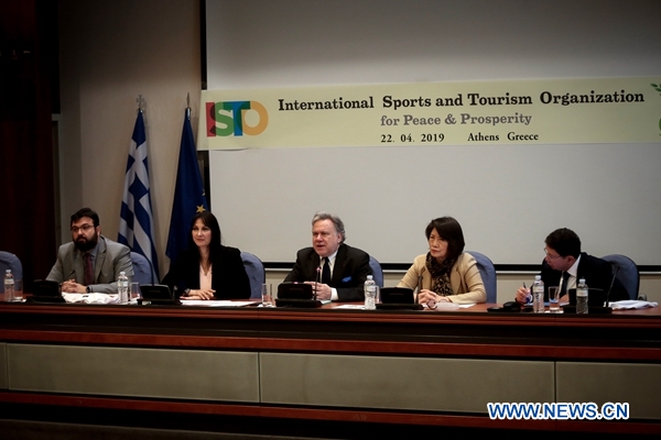 Greek Foreign Minister George Katrougalos (C), Greek Tourism Minister Elena Kountoura (2nd L) and Dho Young-shim (2nd R), chairperson of the UN World Tourism Organization's Sustainable Tourism for Eliminating Poverty (ST-EP) Foundation and also head of a preparatory provision committee for the International Sports and Tourism Organization for Peace and Prosperity (ISO for P&P) , take part in a press conference for the presentation of the ISO for P&P in Athens, Greece, on April 22, 2019. Greece presented on Monday the ISO for P&P, a new international organization which aims to promote peace and prosperity worldwide through tourism and sports. (Xinhua/Marios Lolos)