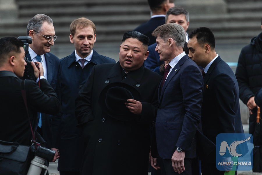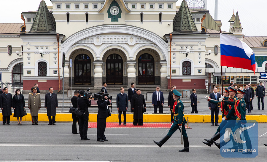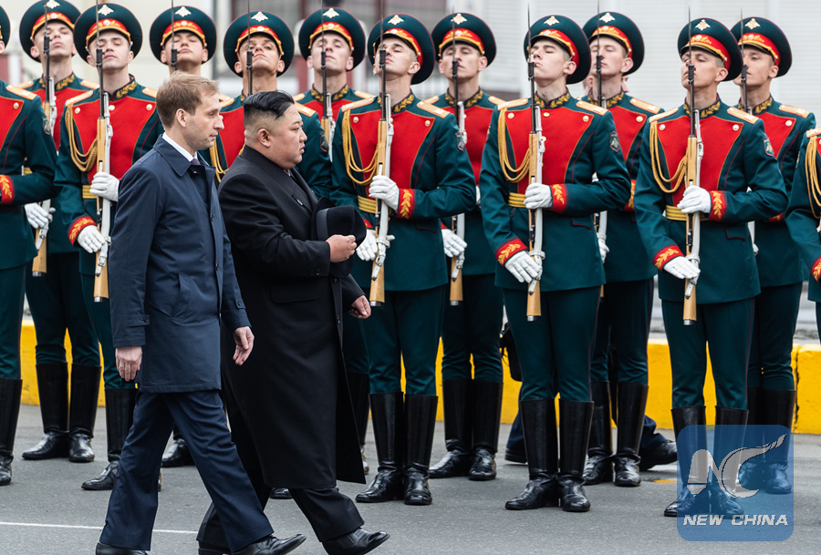 Top leader of the Democratic People's Republic of Korea (DPRK) Kim Jong Un attends the welcome ceremony in Vladivostok, Russia, April 24, 2019. (Xinhua/Bai Xueqi)