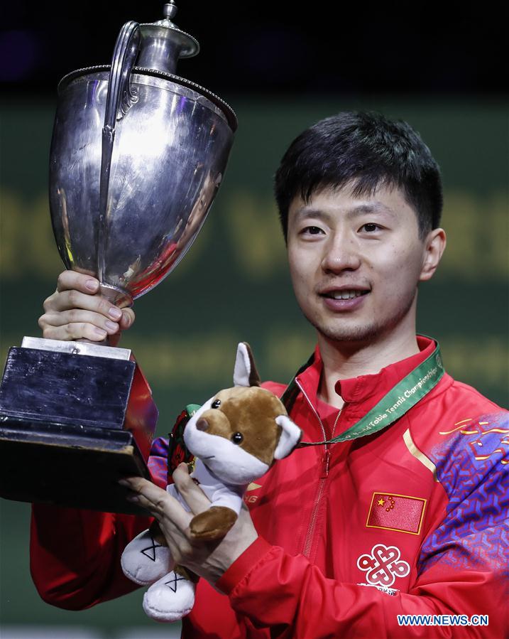 Ma Long of China poses with the trophy during the awarding ceremony of the men's singles final match at 2019 ITTF World Table Tennis Championships in Budapest, Hungary on April 28, 2019. (Xinhua/Han Yan)