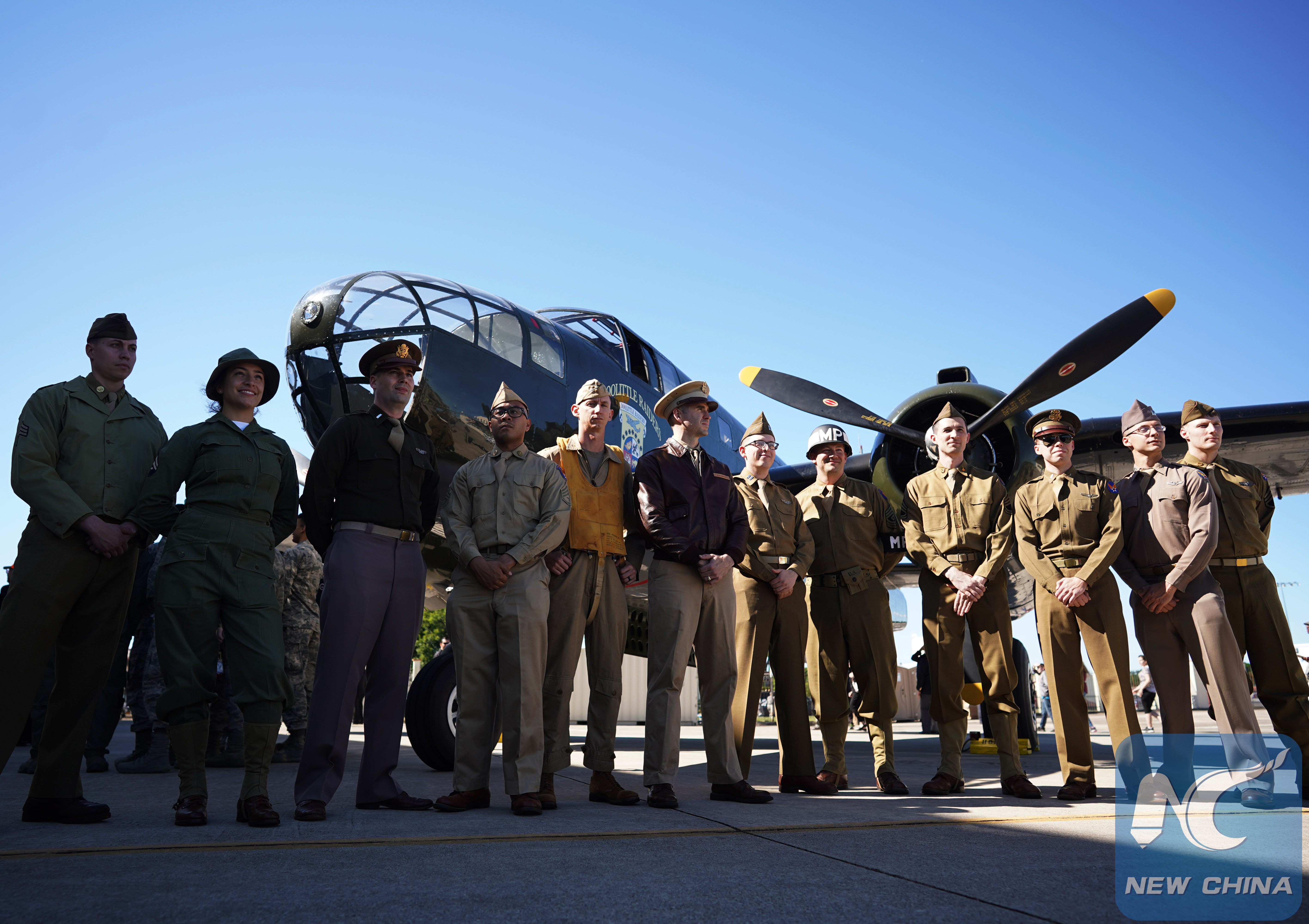 Soldiers stand by a B25 bomber during a memorial service at the Joint Base San Antonio-Randolph, Texas, the United States, April 18, 2019, to celebrate the life of retired U.S. Air Force Lt. Col. Richard "Dick" E. Cole, who was the final surviving member of the famed Doolittle Tokyo Raiders of World War II, and passed away on April 9 at the age of 103. (Xinhua/Liu Jie)