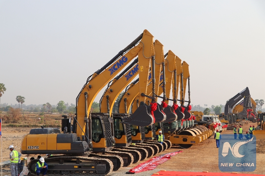 Machines line up during a groundbreaking ceremony for the construction of a 190-km expressway stretching from capital Phnom Penh to the deep-sea port province of Preah Sihanouk in Kampong Speu, Cambodia, March 22, 2019. China Road and Bridge Corporation (CRBC) invests about two billion U.S. dollars for the project, which will be taken four years to be constructed, starting from March 2019 to March 2023. (Xinhua/Mao Pengfei)