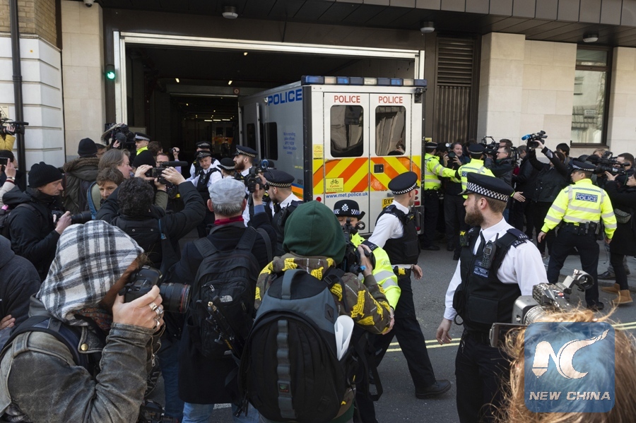 WikiLeaks founder Julian Assange in a police vehicle arrives at the Westminster magistrates court in London, Britain, on April 11, 2019. WikiLeaks founder Julian Assange has been arrested at the Ecuadorian embassy in London, where he was granted refuge in 2012 while on bail in Britain over sexual assault allegations against him in Sweden, police said Thursday. (Xinhua/Ray Tang)