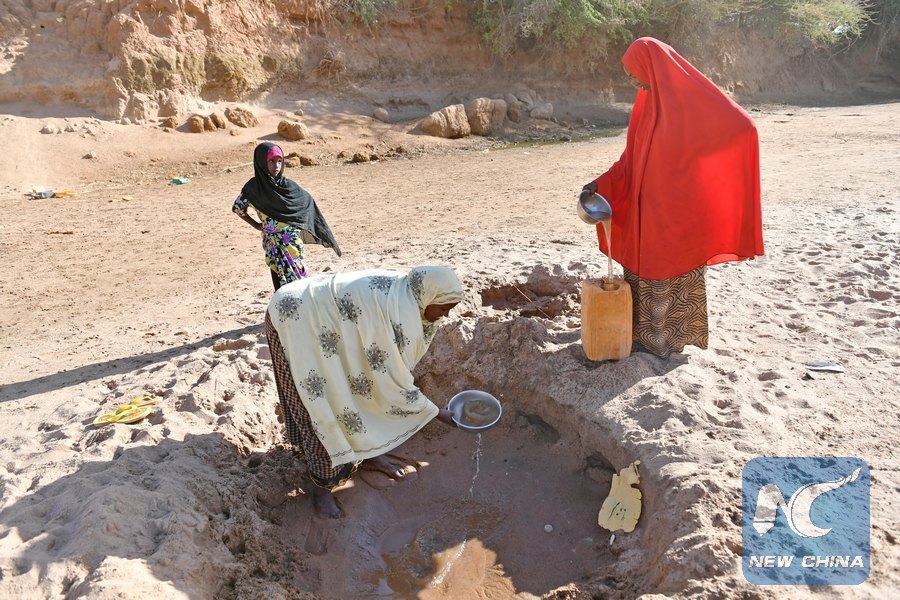 People fetch water from a hole in a riverbed near Doolow, a border town with Ethiopia, Somalia, March 20, 2017.(Xinhua/Sun Ruibo)